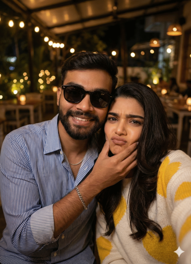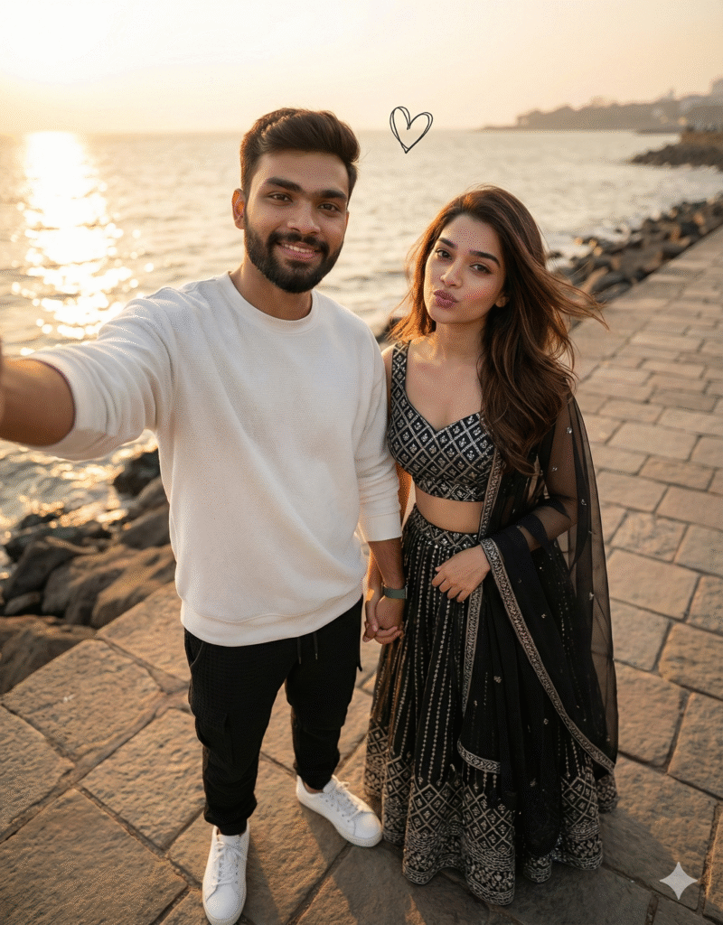 prompt Combine both the photos and make the boy stand beside the girl to create a cute couple mirror selfie. Make sure both photos have the same color grading, lighting, and tone so they blend naturally and look real. Adjust the boy’s body angle and gaze slightly toward the phone camera in the mirror, not straight ahead. If needed, adjust his pose to match the girl’s position for a natural look. Keep it ultra-realistic, 8K DSLR clarity, soft lighting, and perfect reflection balance….
