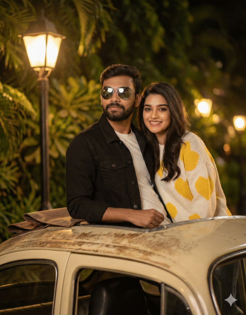 8K ultra-realistic cinematic close-up of an influential young couple on a vintage car roof under a warm street lamp. Faces 100% original—bright, sharp, natural. The man in reflective aviators leans back in a calm, hero-style pose, gazing away; the woman stands close with a graceful expression. Soft greenery and golden light create a timeless romantic night vibe…