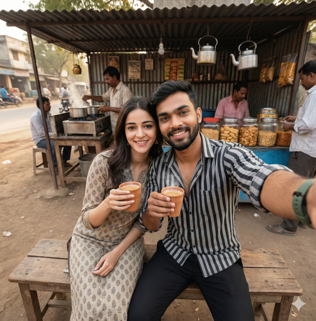 A realistic outdoor selfie of the same couple (faces 100% identical to uploaded images) sitting on a wooden bench near a small Indian tea tapri, holding earthen cups of hot chai. Wide-angle front mobile camera, no bokeh, no blur, everything in sharp focus. Soft daylight, no flash, warm natural tones, and balanced contrast.,