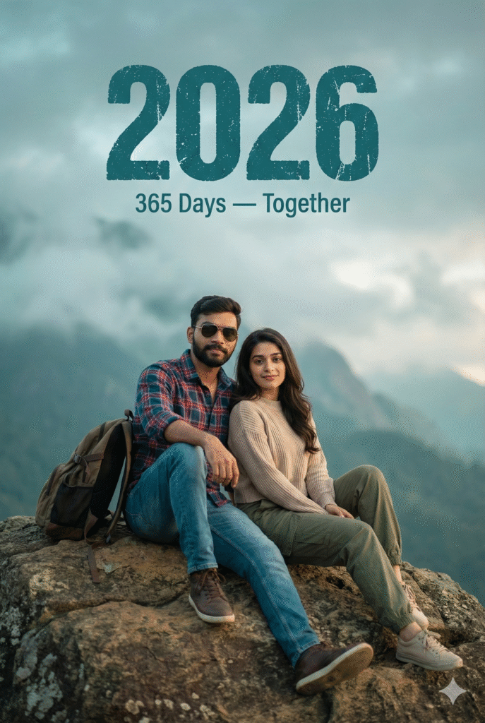 A cinematic vertical couple portrait. The man (same face and outfit: red-blue plaid shirt, jeans, aviators) sits casually on a large rock, backpack beside him. Next to him sits a young woman with soft expression, long hair, and a modern neutral outfit. Behind them, misty teal-grey mountains create a dreamy travel vibe. Soft dramatic lighting. Bold distressed teal text at the top reads “2026”, with smaller text below: “365 Days — Together”..