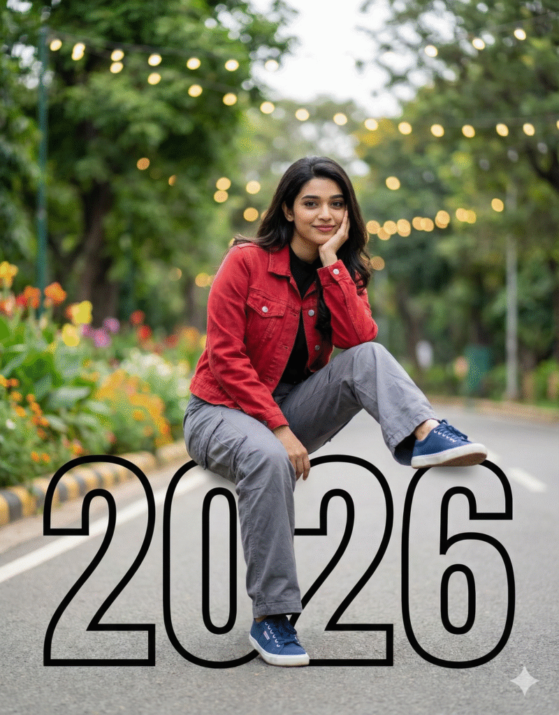 A young stylish woman sitting confidently on large “Happy New Year2026” numbers placed on a road in a beautiful park. The numbers have a futuristic black outline. He is wearing a black shirt, red denim jacket, grey cargo, and blue sneakers. The background shows green trees, colorful flowers, and a soft lights. The atmosphere feels modern, cinematic and positive – symbolizing a fresh new year and new beginnings, ultra realistic, depth of field, perfect lighting. ..