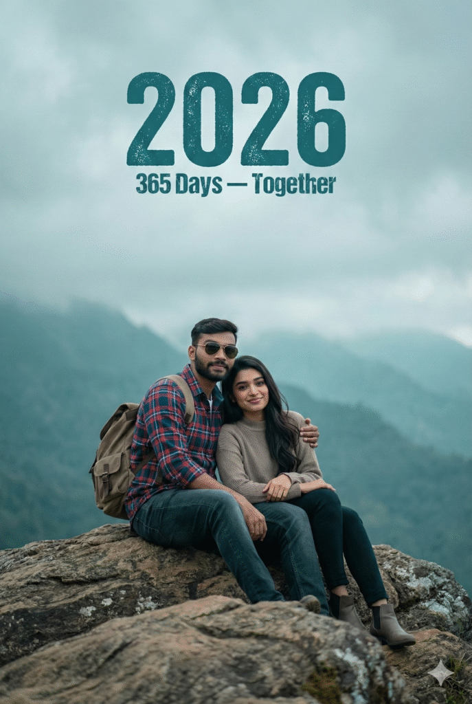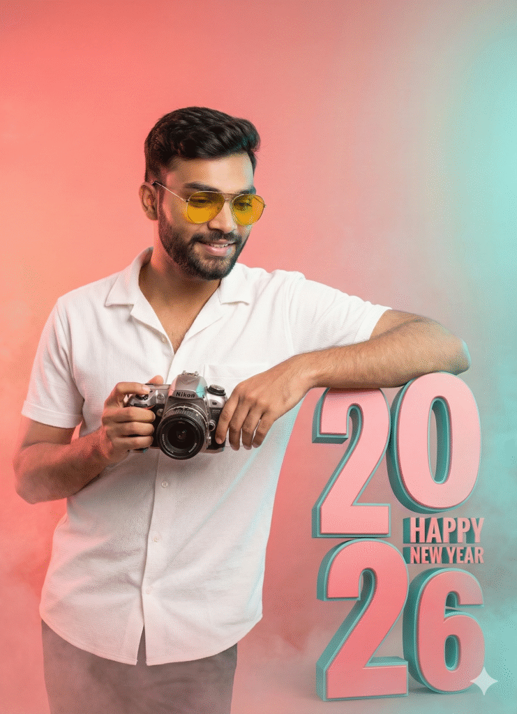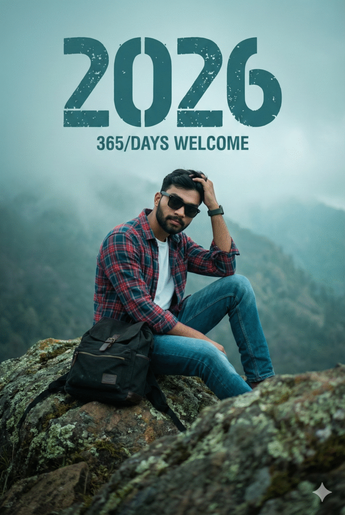 Uploaded man wearing a open marun shirt with black t shirt and cargo. The composition is double exposure style: a large, dominant portrait of the man in the background, with a smaller, full body version of him layered in the foreground. Dominant text in a modern, bold font “2026” with the subtitle “A NEW JOURNEY” and “365/365”. At the bottom, stylized, glowing cursive text says “HAPPY New Year”. Baground dark and lighting, flowing baluns, smoke behind his. A small TrickyDost signature in left corne…SMILING]