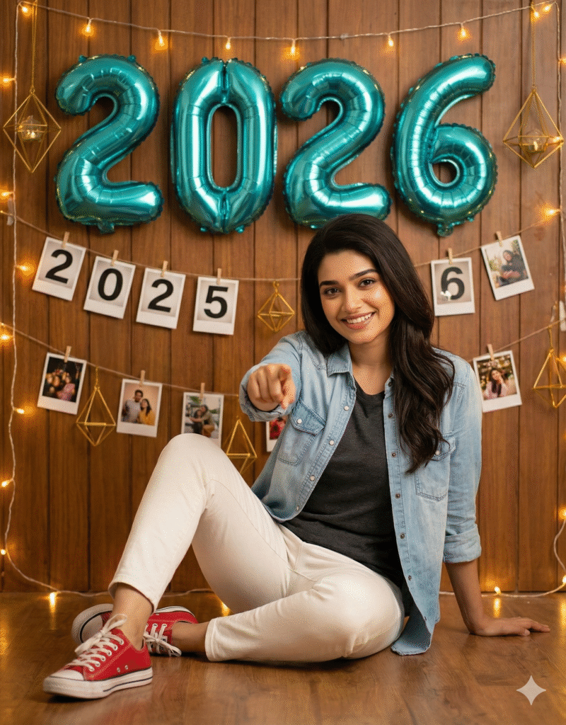 A festive New Year 2026 portrait of a confident young woman sitting relaxed on the floor, pointing at the camera. Light blue denim shirt, dark gray tee, white pants, red sneakers. Wooden wall with fairy lights, teal “2026” balloons floating 2025 polaroids, golden geometric shapes, modern studio vibe.