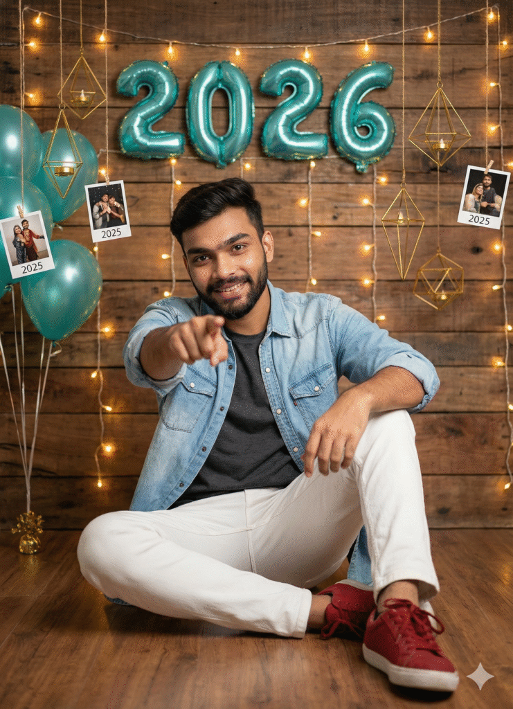A festive New Year 2026 portrait of a confident young Man sitting relaxed on the floor, pointing at the camera. Light blue denim shirt, dark gray tee, white pants, red sneakers. Wooden wall with fairy lights, teal “2026” balloons floating 2025 polaroids, golden geometric shapes, modern studio vibe.