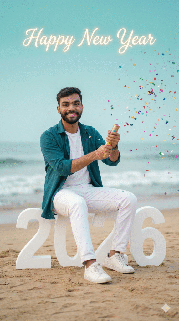 Use the uploaded photo face as the main subject. Create a realistic New Year celebration photo at a beachside location. The person is sitting confidently on large white “2026” numbers placed on sand near the ocean. Outfit: – Teal/sea-green open shirt – White t-shirt inside – White pants – White sneakers Pose & Expression: – Sitting relaxed – Smiling confidently – Both hands holding a party popper, just popped Action & Effects: – Colorful confetti frozen mid-air – Celebration moment captured naturally Background: – Soft turquoise sky – Calm ocean waves slightly blurred – Minimal, clean, premium look Text: – “Happy New Year” written at the top in soft glowing cursive font Lighting & Style: – Natural daylight – Soft cinematic lighting – Clean skin tones, realistic texture – DSLR photography look Quality & Framing: – Ultra-realistic – High resolution – Shallow depth of field – Sharp focus on subject – Vertical 9:16 Instagram-ready composition Do not change face identity. No extra text. No watermark.
