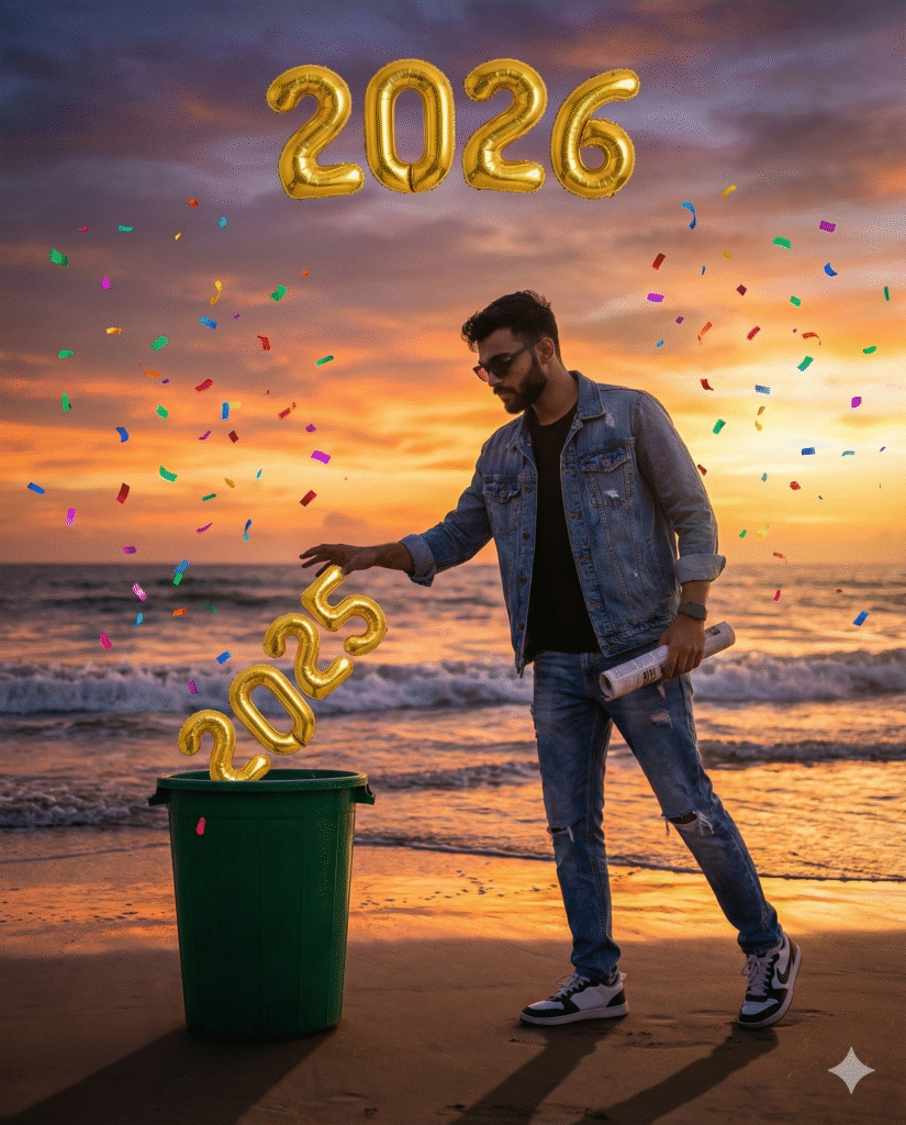 A young stylish boy standing on a beach at sunset, throwing away golden balloon numbers ‘2025’ into a green dustbin, holding a rolled newspaper, wearing casual streetwear outfit, ripped jeans and sneakers, modern hairstyle, sunglasses, colorful confetti flying in the air, golden balloon text ‘2026’ floating above, ocean waves in background, dramatic sky, creative New Year concept, cinematic lighting, ultra-realistic, high detail, sharp focus, vibrant colors, 4K Instagram creative edit style”.
