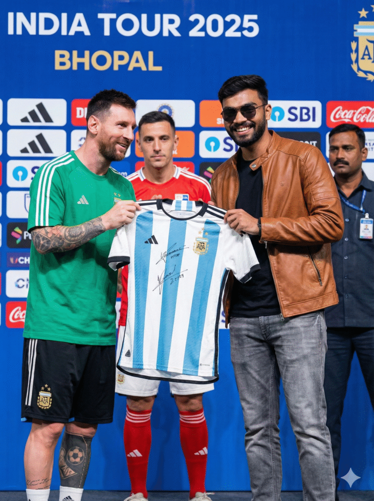 A high-resolution, candid press photograph taken on the stage from image_13.png and image_14.png. Lionel Messi, wearing his green Adidas t-shirt and black shorts, is handing a white jersey with blue stripes, which he has just signed with a black marker, to the user. The user, from image_16.png, replaces Rahul Gandhi and is wearing his black t-shirt, unzipped brown jacket, grey jeans, and sunglasses. He is smiling broadly as he receives the signed jersey. The man in the red and white kit and the security guard from image_13.png are still present in the background. The “INDIA TOUR 2025 BHOPAL” backdrop with sponsor logos is clearly visible. The lighting is bright and professional, image ratio – 3:4.