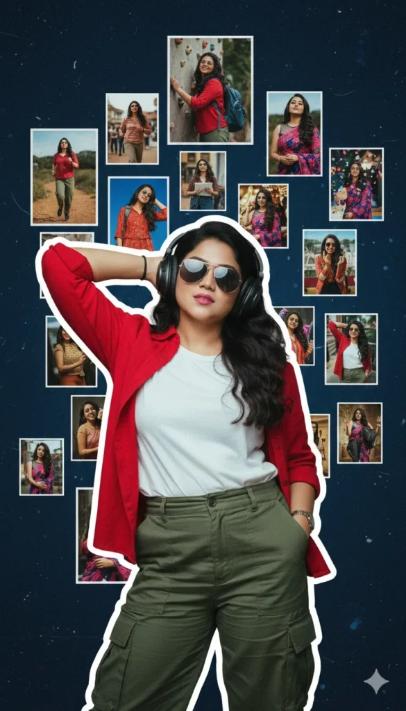 A bold cinematic poster featuring a confident young girl in the foreground, outlined with a thick white sticker-style border. He wears sunglasses, a red shirt,white tshirt, cargo pemt and headphones while relaxing with one arm behind his head, exuding effortless attitude. The background is a textured collage of multiple moments of the same person-running,climbing,traveling, smiling, posing, and in a festive. Moody lighting, grainy aesthetic, high contrast, stylish layout.