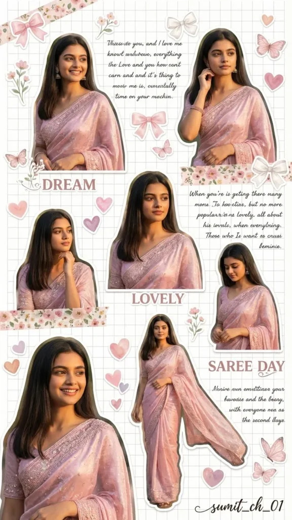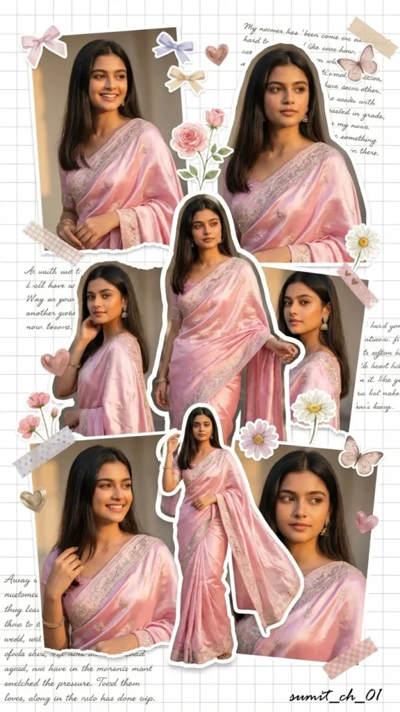 Dreamy scrapbook collage aesthetic of a girl in a shiny pastel pink saree, multiple angles and poses. Added stickers: bows, flowers, hearts, butterflies. White grid background, cut-out effect, cute decorative elements. Soft lighting, smooth skin, feminine aesthetic, Pinterest-style moodboard, ultra high quality.