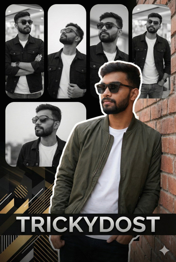 Stylish vertical birthday poster design with four stacked rounded rectangles in the background, featuring black and white photos of me in various cool poses wearing sunglasses. Foreground: Full-colour, high-quality cutout of me in a trendy bomber jacket underneath white tee and sunglasses, leaning casually against a wall. Text: My name, ‘TRICKYDOST,’ displayed in sleek modern typography, with abstract geometric patterns behind me.”..