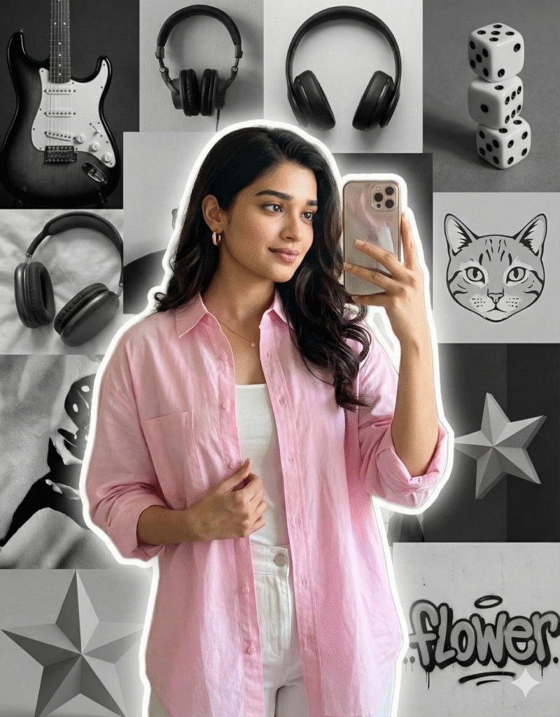 A stylish young woman taking a mirror selfie, wearing a baby pink loose shirt and white pants. She holds the shirt casually with one hand, wearing minimal jewelry, and her long hair is styled in a cute, realistic way. The lighting is soft and natural, with a subtle white outline glow around her. The background features a modern grayscale aesthetic collage, including elements like an electric guitar, headphones, dice, cat face decor, 3D stars, and ‘flower’ graffiti text. The image should have an artistic, trendy Instagram-style edit with a balanced composition and HD quality.