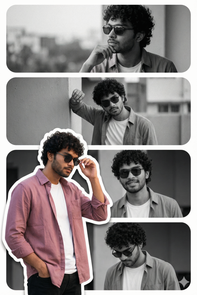 Create an attractive, premium collage of a stunning young girl with her real face unchanged, captured in 4–5 stylish poses: a confident hands-on-waist portrait, a dreamy upward gaze with glossy sunglasses, a bright smiling close-up, and a soft walking shot with cinematic depth. Make the center image vibrant in pastel tones—white fitted tee, peach-pink overshirt, blue jeans—while the outer frames appear in elegant black-and-white for high contrast. Use a smooth beige background