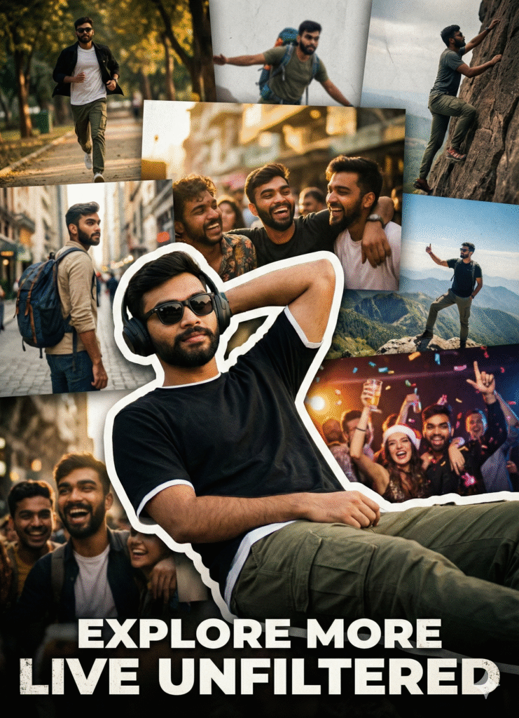 A bold cinematic poster featuring a confident young boy in the foreground, outlined with a thick white sticker-style border. He wears sunglasses, a black shirt,white tshirt, cargo pent and headphones while relaxing with one arm behind his head, exuding effortless attitude. The background is a textured collage of multiple moments of the same person-running,climbing,traveling, smiling, posing, and in a festive. Moody lighting, grainy aesthetic, high contrast, stylish layout…