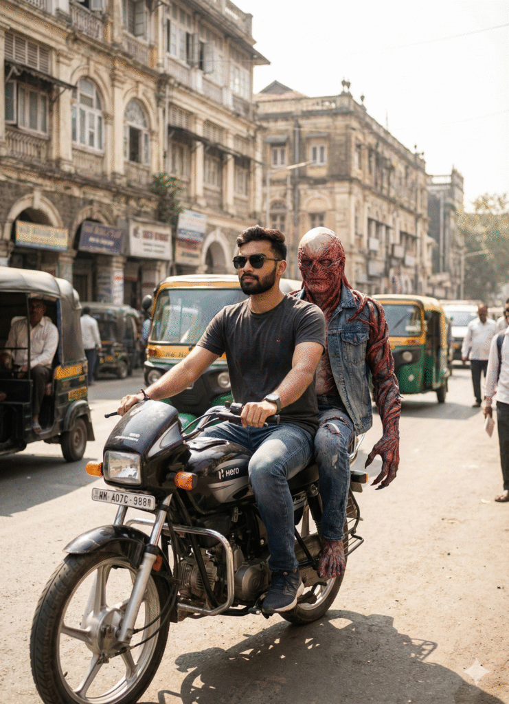 “Create an ultra-realistic cinematic photo on a busy Indian street in daytime. Replace the motorcycle rider in the reference image with my face from the uploaded photo. Match my exact facial features, beard shape, hairstyle, eyebrows, and skin tone. My expression should look calm and focused while riding the bike. Keep my posture the same: leaning slightly forward, hands on the handle, sitting on a Hero motorcycle. Maintain the same clothing style: simple t-shirt, jeans, and sunglasses if needed. Behind me, show a highly detailed Vecna (from Stranger Things) sitting as the pillion passenger. Vecna must look terrifying yet casually sitting on the bike, wearing a denim jacket and jeans exactly like the reference. Include all his detailed textures — red organic vines, cracked skin, dark patterns, and creepy claws lightly holding the bike for balance. Recreate the full street environment: old British-era buildings, auto rickshaws, pedestrians walking, sunlight casting natural shadows on the road, and a slightly dusty urban atmosphere. Show traffic, people looking around, parked rickshaws, and city life. Lighting must match the reference perfectly — bright natural daylight, harsh shadows, warm tones reflecting off buildings, and realistic reflections on the motorcycle. Ensure the image looks like real street photography: 35mm lens, documentary style, crisp details, proper depth of field, natural motion blur, and TRUE photorealistic finishing. Composition, angle, colors, environment, and realism should be EXACTLY like the reference scene — but with my face as the rider.”