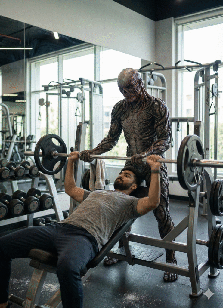 Behind me stands a detailed, intimidating Vecna-style creature (from Stranger Things), covered in organic vines and textured skin, acting as my spotter while I bench-press. Vecna’s hands are gripping the barbell, helping me lift, creating a surreal mix of horror and humor.