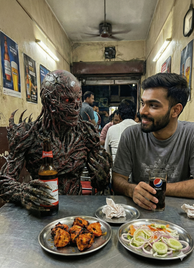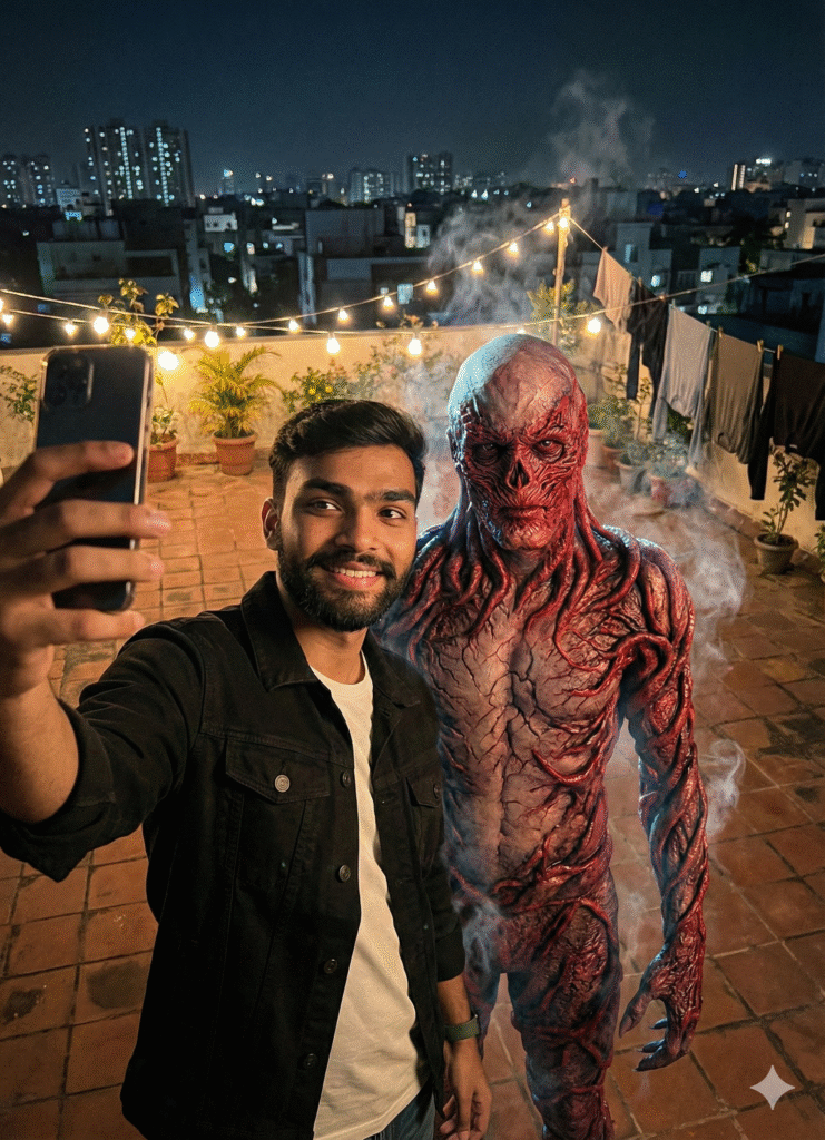 Prompt – “Create a hyper-realistic cinematic scene of me inside a small Indian kitchen, sitting casually on the kitchen counter, smiling and holding a hot cup of chai. Use my uploaded photo for the face, expression, skin tone, beard and hairstyle — keep my look natural and unchanged.Next to me, include a detailed, intimidating Vecna-style monster (from Stranger Things), tall and covered in dark organic vines and twisted skin texture. The Vecna creature is politely offering chai to me, creating a contrast between horror and humor.Add warm morning sunlight entering through a window behind Vecna, soft atmospheric smoke/steam from the chai, and realistic shadows. The mood should feel friendly, cinematic, and surreal.Keep my original clothes from the photo. Maintain the same kitchen setup: steel utensils, spice box, gas stove, sink, and warm tones. Ultra-realistic lighting, 50mm lens, shallow depth of field, movie-grade texture.”