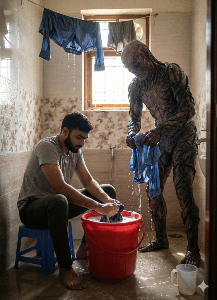 Next to me stands a tall, detailed Vecna-style creature (from Stranger Things), covered in dark organic vines and twisted skin, completely wet as if helping with washing clothes. Vecna is squeezing a soaked shirt, water dripping from his hands.Maintain the same room style: tiled walls with floral border, window light behind Vecna, hanging wet clothes on a rope, water on the floor.Keep the cinematic soft light, warm realism, shallow depth of field, detailed textures, moisture, reflections, and natural shadows exactly like the reference. Ultra-realistic, 50mm lens, documentary style, high detail, atmospheric realism.”
