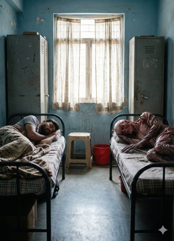 “Create a hyper-realistic cinematic photo inside an old Indian hostel room with two metal beds, damaged walls, peeling paint, lockers on both sides, and soft daylight coming from a window with thin patterned curtains. Replace the man in the reference image with my face from the uploaded photo. Match my exact facial features — beard shape, eyebrows, hairstyle, skin tone, and natural expression. I am sleeping curled up on the left bed, in a peaceful fetal position, just like the reference posture. Keep my clothing simple and realistic. On the right bed, place a detailed Vecna creature (Stranger Things style), lying down and sleeping calmly. Show the organic red vines, cracked fleshy textures, sinewy skin, and subtle shadows on his face. Vecna should look oddly peaceful, creating a surreal contrast. Recreate the same room atmosphere: dusty floor, metal bed frames, rumpled bedsheets, lockers with scratches, curtain glowing with soft natural light, a small plastic stool, and a red bucket on the floor. Lighting must perfectly match the reference — soft diffused daylight from the window, shadows falling naturally across my face and the room, slightly moody, documentary realism. Camera style: 35mm or 50mm lens, cinematic framing, shallow depth of field, natural grain, muted colors, high detail in skin and textures, and EXACT same angle, composition, perspective, and mood as the reference, but with my face.”